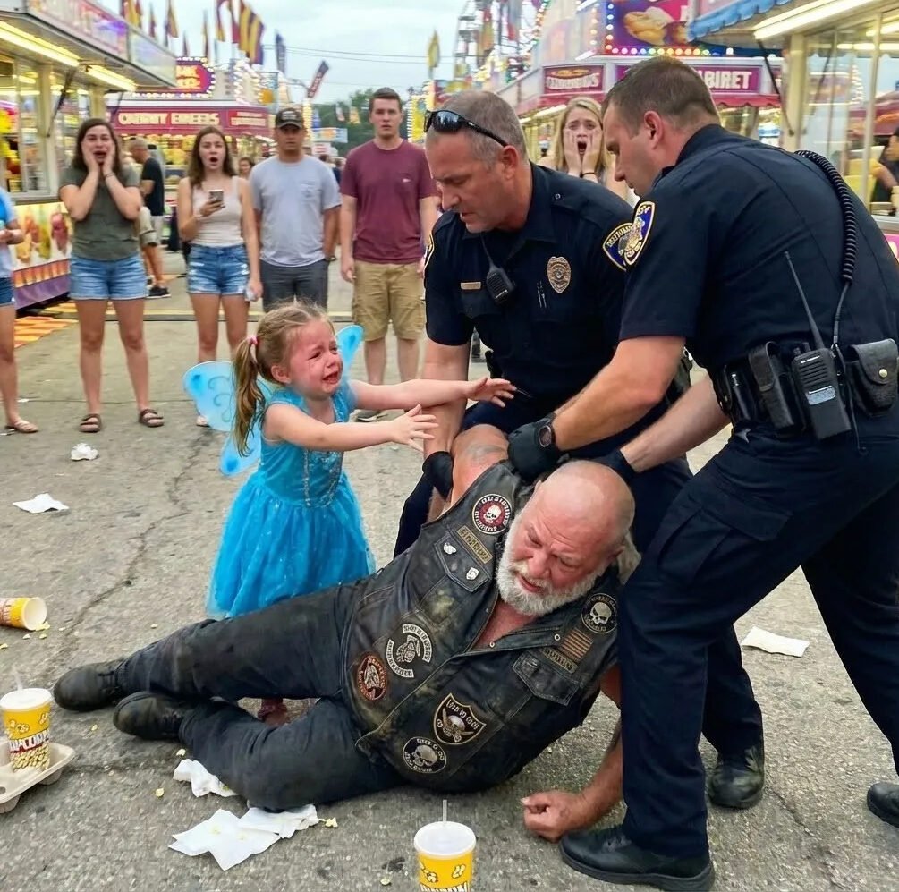 My daughter’s scream cut through the noise of the county fair like a siren, sharp enough to stop every heartbeat in its path. “That’s my grandpa!” she cried, her tiny fists pounding against the arms of the police officers who were pinning my father to the ground. A five-year-old in a pink fairy dress fighting grown men because someone decided a leather vest and long gray hair were signs of a criminal. It was a moment that would fracture our family’s sense of safety, expose the cruelty of assumptions, and reveal the fierce loyalty between a grandfather and the little girl who adores him.