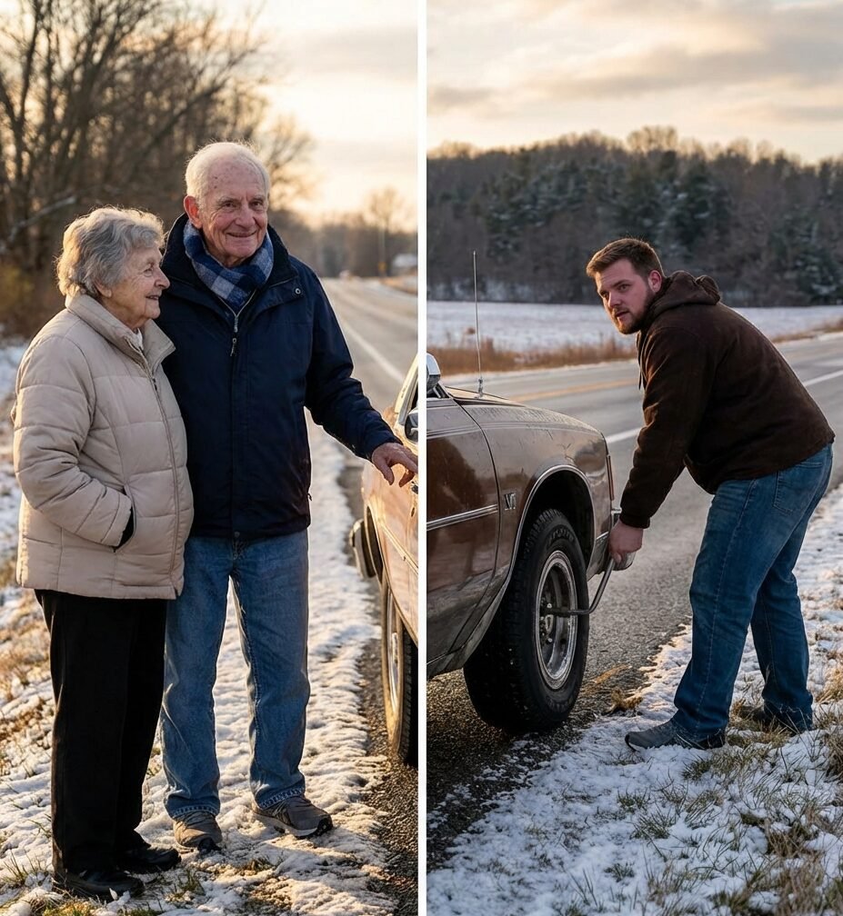 I almost didn’t pull over that day. Snow fell thickly, cars sped past, and my seven-year-old daughter sang happily in the back seat as we drove to my parents’ house for Thanksgiving. But when I saw an elderly couple standing beside a battered car with a flat tire, shivering in thin coats, I couldn’t drive past. Something in me compelled me to stop. I told myself it would only take a few minutes, never imagining that this brief choice would quietly set off a chain of events that would reshape my entire life.